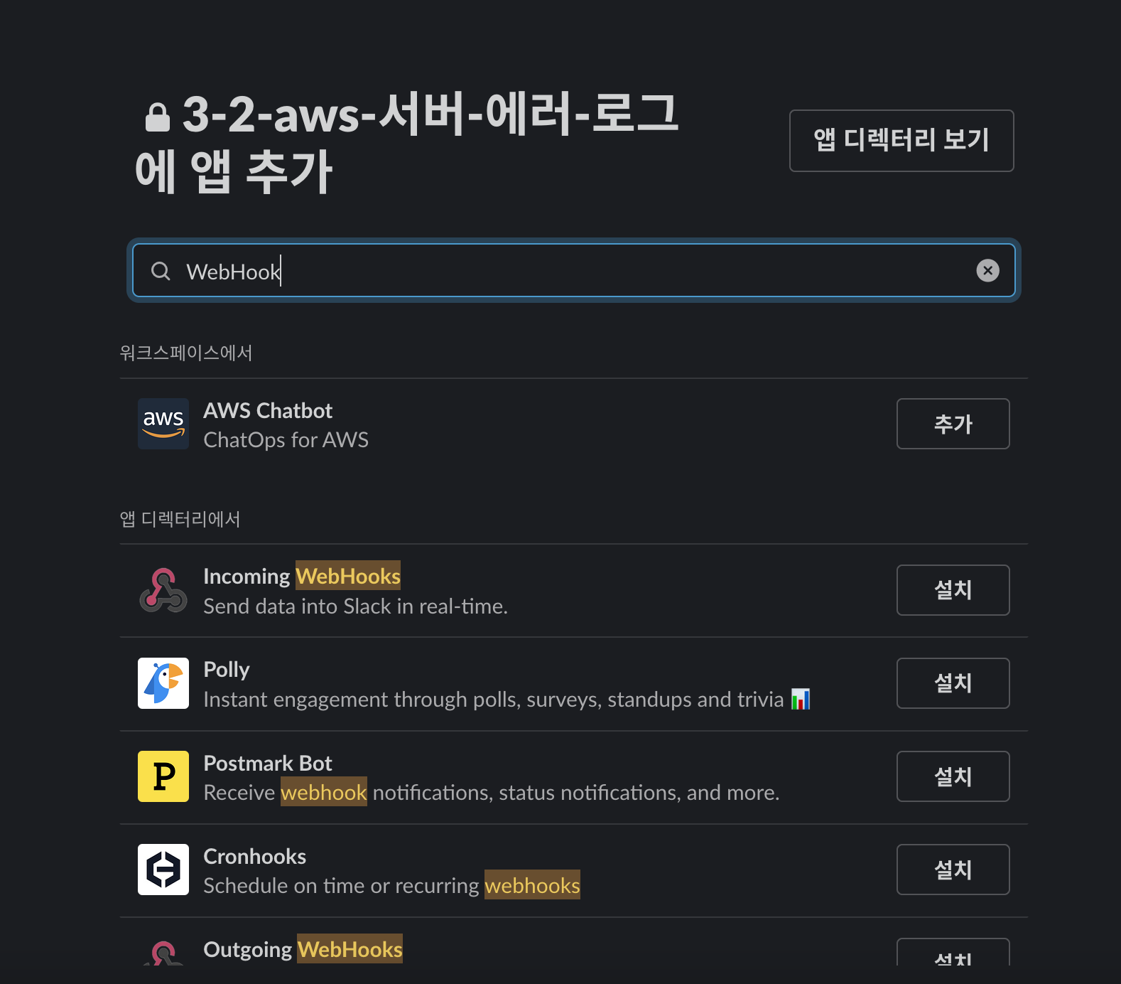 - 채널에 포스트 -> 아까 생성한 채널 클릭 후 '수신 웹후크 통합 앱 추가' 버튼 클릭