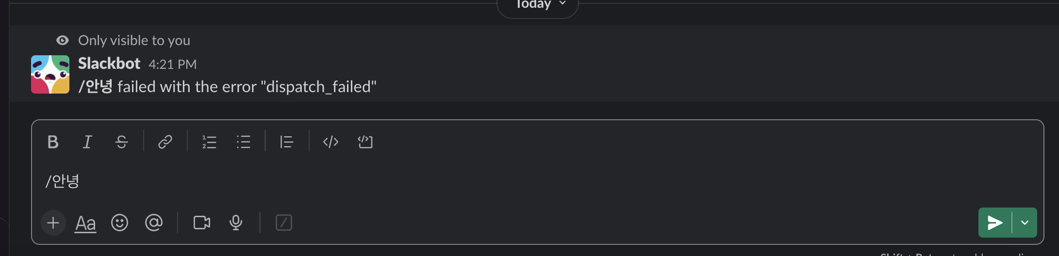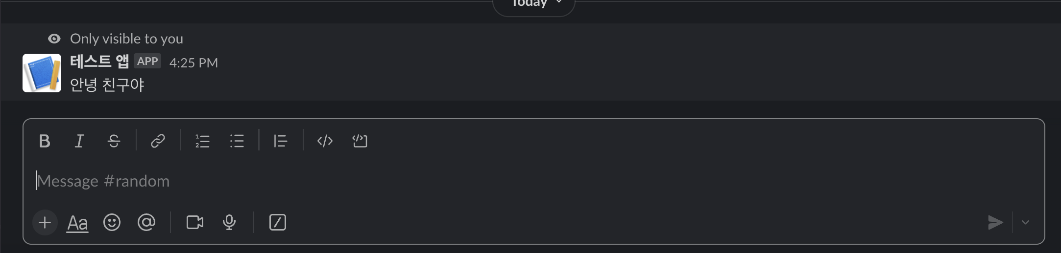 생성 후 /안녕 커맨드를 슬랙에서 사용해봅니다.