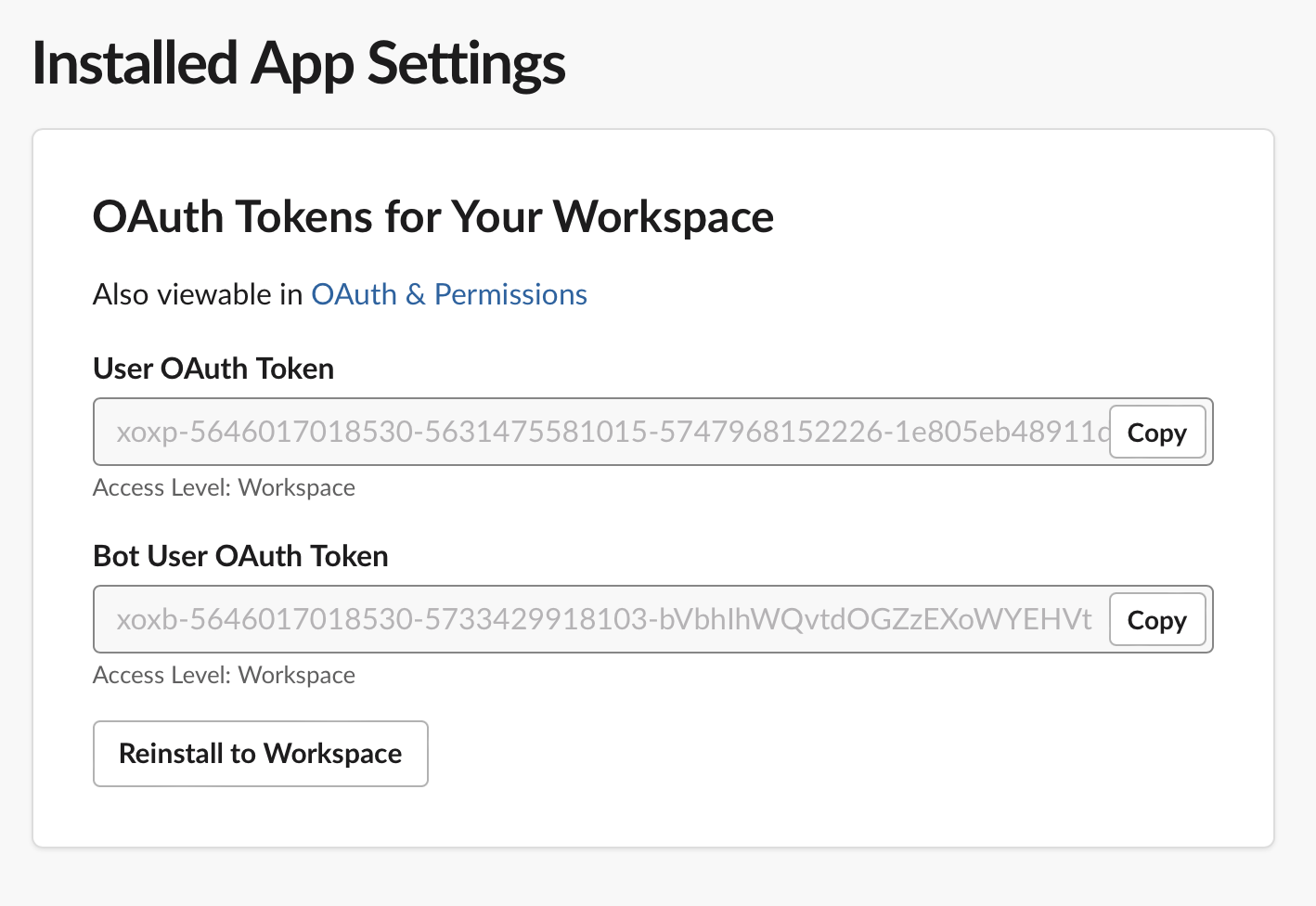 다시 돌아가서 Install App -> Install to Workspace를 선택하면 다음과 같은 메세지가 나옵니다: