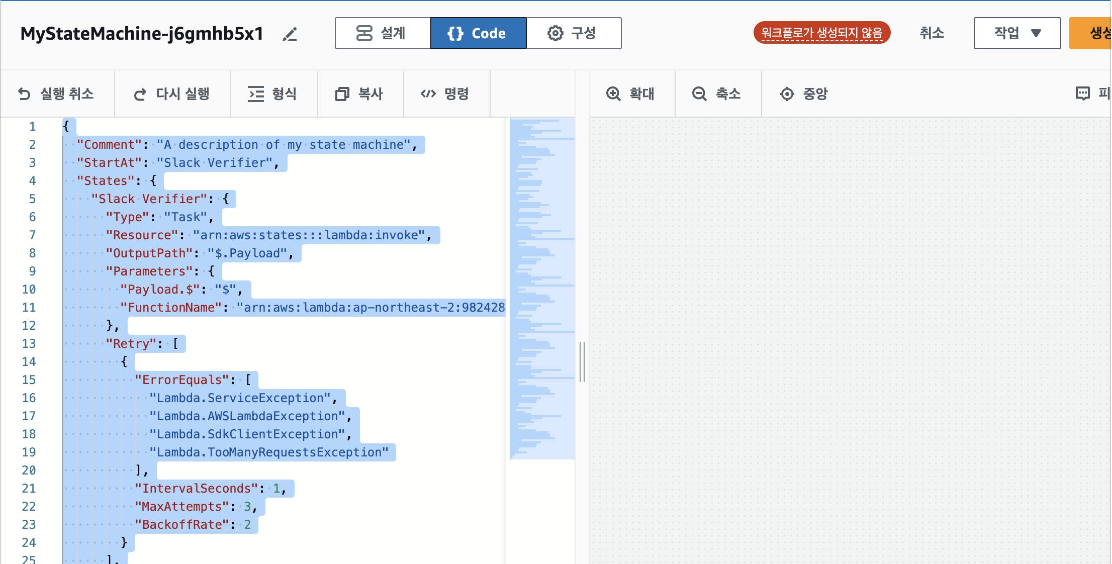 다음과 같이 State Machine을 구성했다. AWS가 참 사용하기 편리하게 만들어뒀다.