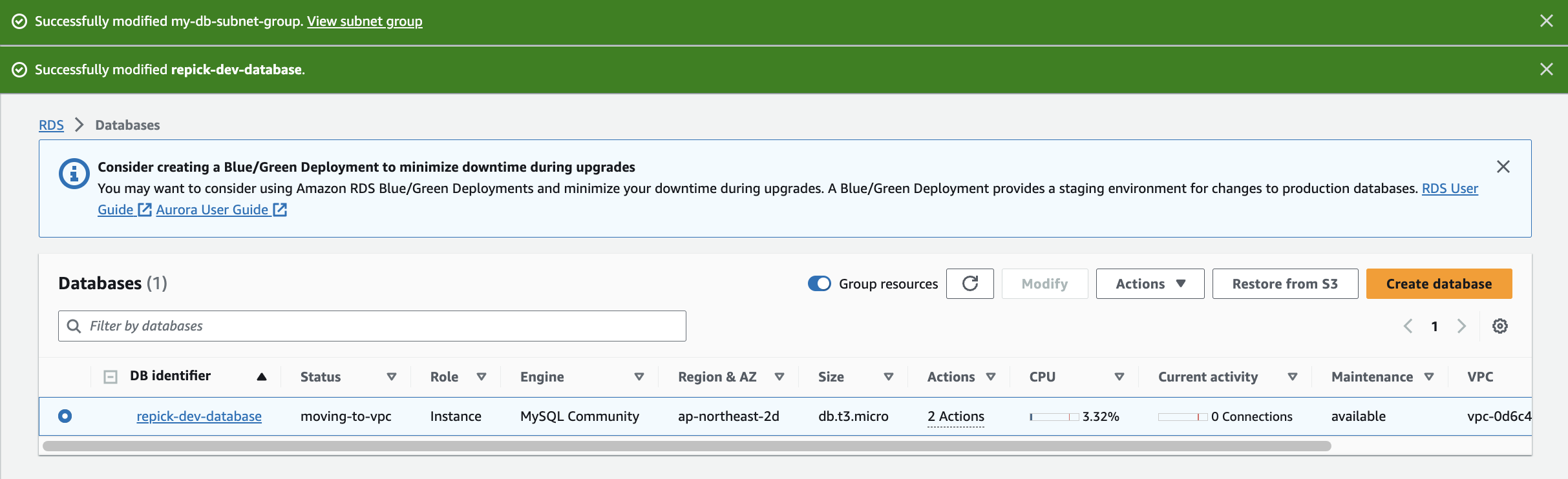 (사실 잘 모르고 새로 만들었는데 subnet group만 바꾸면 되더라. 프로비저닝 오래걸리니까 나같은 실수 하지 마시길)