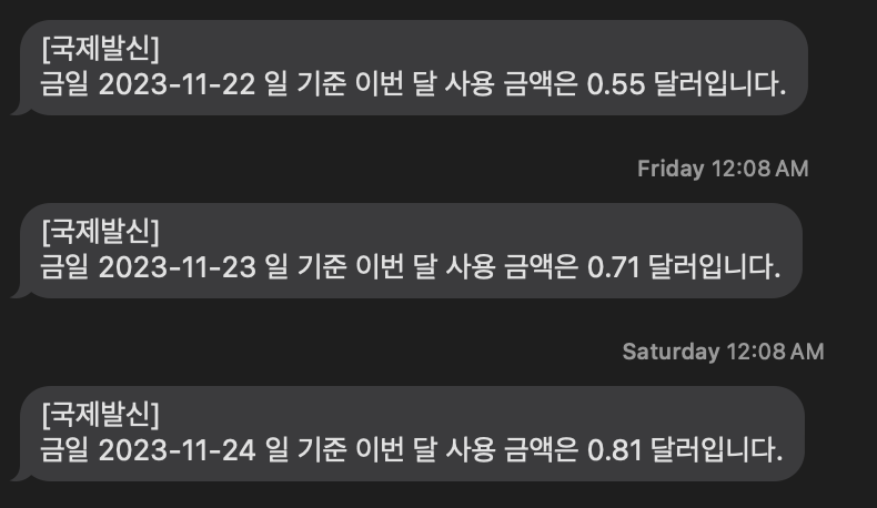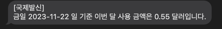 - 결과적으로 message_content = "금일 %s 일 기준 이번 달 사용 금액은 %s 달러입니다."%(str_today, str_cost) 라는 메세지를 보내고,