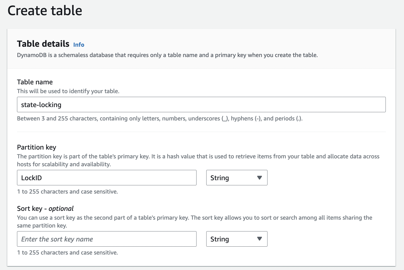 파티션 키로 LockID 를 입력하고, 타입은 String 으로 두고 생성합니다.