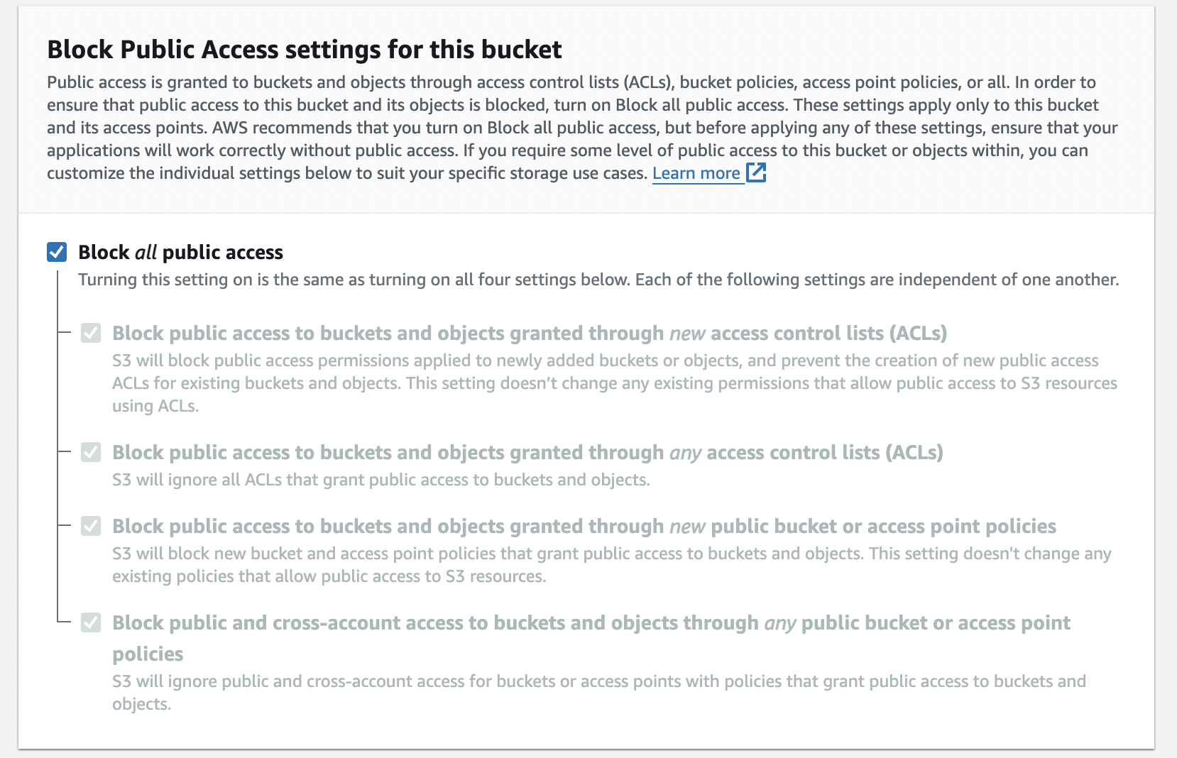 S3 버킷을 구성합니다. 이 때 public access는 차단하는 것을 권장합니다.