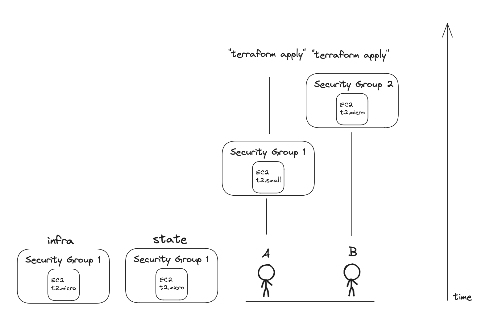 이 때, 두 유저가 terraform apply 를 동시에 실행하여 한 계정에 적용을 시도합니다.