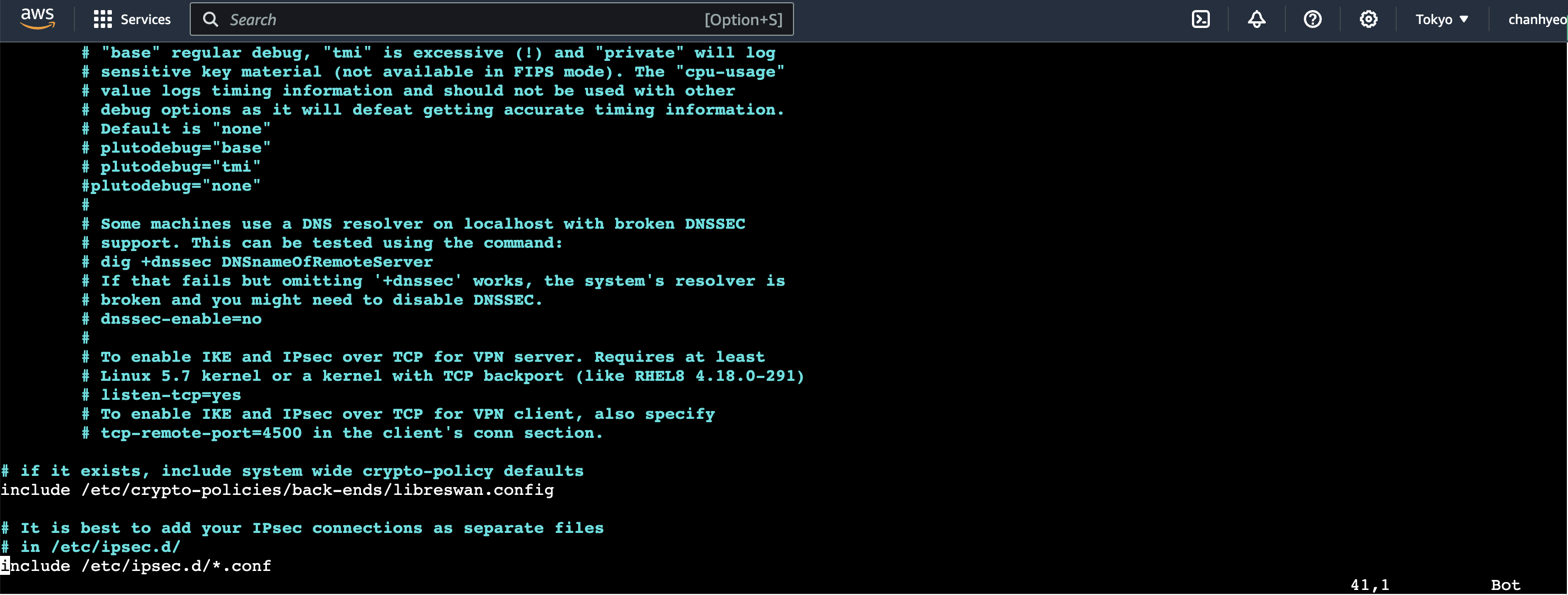 다음으로, /etc/ipsec.conf 파일을 열어 include /etc/ipsec.d/*.conf 엔트리가 있는지 확인합니다.