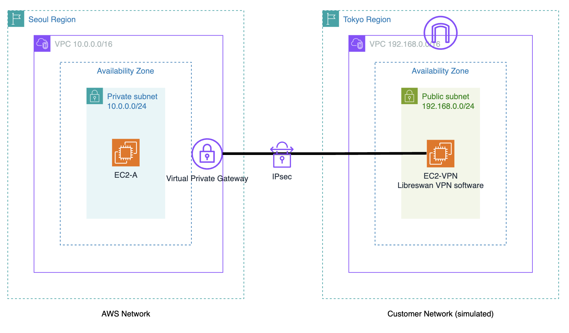 AWS Network - Customer Network의 Site-to-Site VPN 연결을 구성해보겠습니다. 다음을 위해선 실제 Customer Network가 필요하지만, 저희는 도쿄 리전에 있는 EC2 인스턴스로 Customer Network를 흉내내어 구성해보겠습니다. 기본적 환경 구성의 경우 테라폼 소스 코드를 공개해 두었으므로 이를 통해 손쉽게 구성 가능합니다.