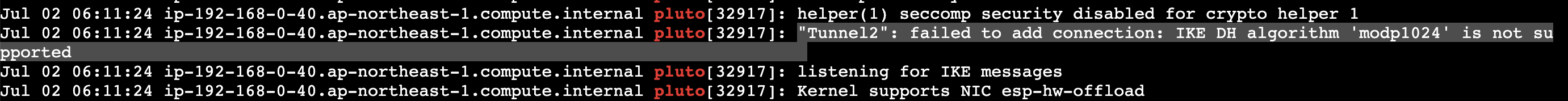 - 이 경우 aws.conf 파일에 입력한 알고리즘 선택에 문제가 있을 확률이 높습니다. 올바른 알고리즘 조합을 사용하였는지 검토하고 sudo systemctl restart ipsec.service 명령어를 통해 다시 실행해보세요.