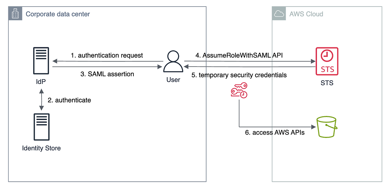 다이어그램을 통해 SAML 2.0 Federation 이 어떻게 이루어지는지 이해합니다. 해당 시나리오에서 유저는 Corporate data center 의 IdP(Identity Provider) 를 이용하여 최종적으로 AWS Cloud 의 S3 버킷으로 접근하고자 합니다. IdP 와 AWS 간 trust relationship 이 이미 형성되었다고 가정합시다. AWS Cloud 에 접근하는 방법은 다음과 같습니다: