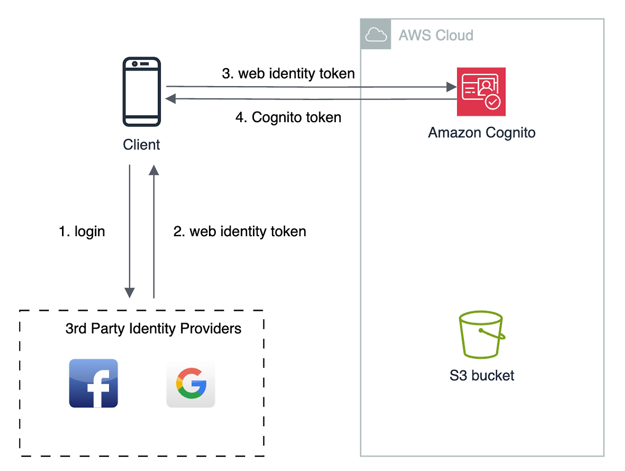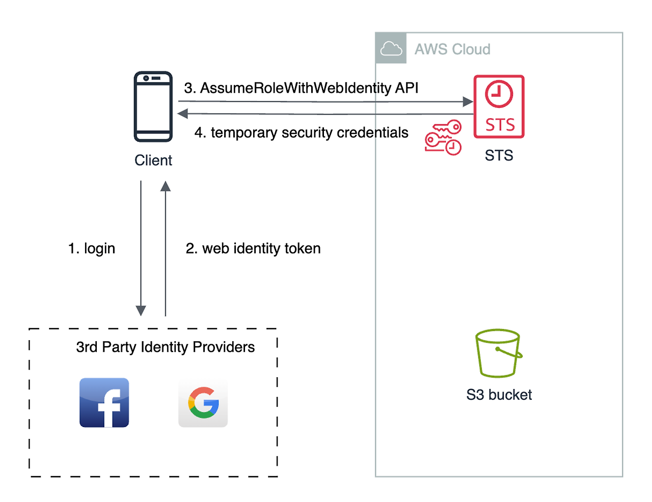 Web Identity Federation 을 구현하는 데 있어 Cognito 를 사용하는 것이 권장됩니다. 이는 다음의 과정들을 포합합니다: