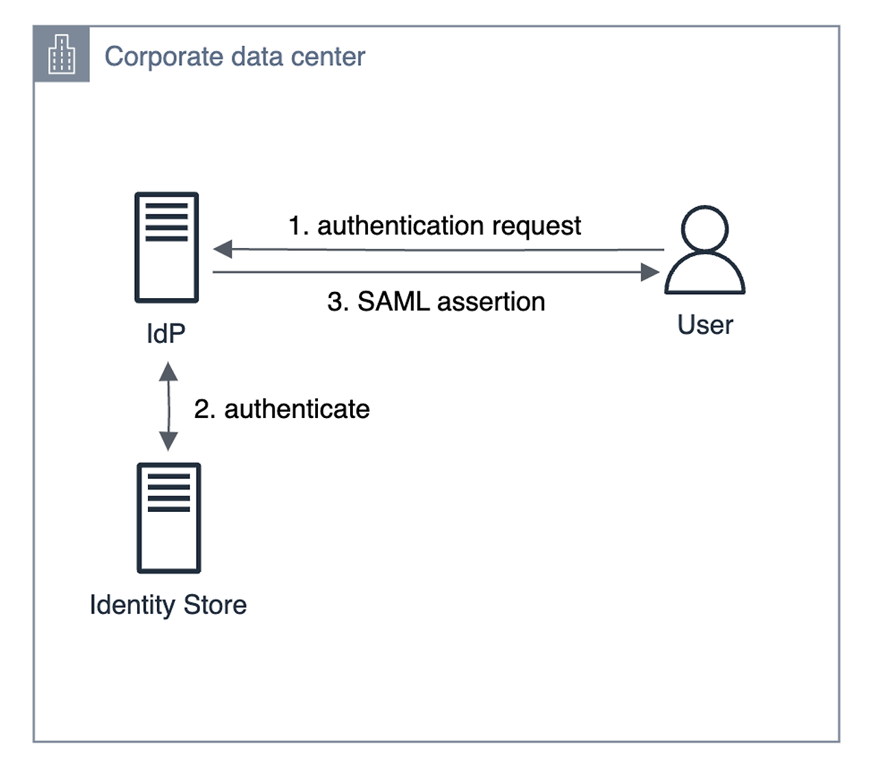 - 사용자가 Corporate data center 에서 Identity Provider 로 인증을 요청합니다.