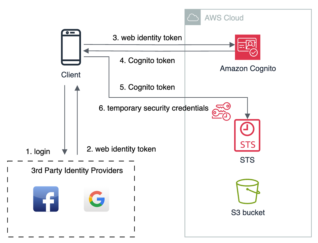 Web Identity Federation 을 구현하는 데 있어 Cognito 를 사용하는 것이 권장됩니다. 이는 다음의 과정들을 포합합니다: