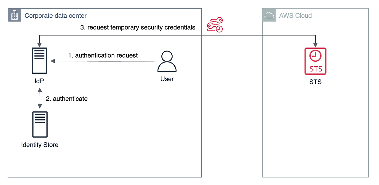 다이어그램을 통해 SAML 2.0 Federation 이 어떻게 이루어지는지 이해합니다. 해당 시나리오에서 유저는 Corporate data center 의 IdP(Identity Provider) 를 이용하여 최종적으로 AWS Cloud 의 S3 버킷으로 접근하고자 합니다. IdP 와 AWS 간 trust relationship 이 이미 형성되었다고 가정합시다. AWS Cloud 에 접근하는 방법은 다음과 같습니다: