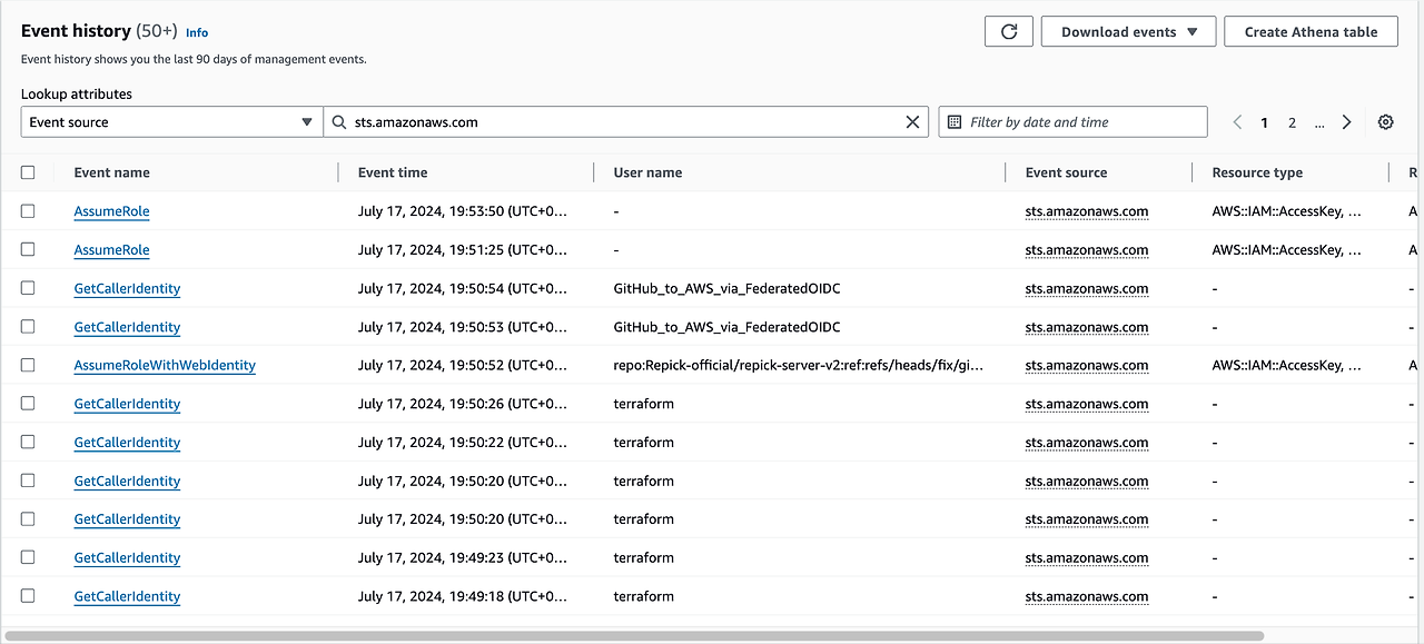 GetCallerIdentity 와 AssumeRoleWithWebIdentity 이벤트를 확인할 수 있습니다.