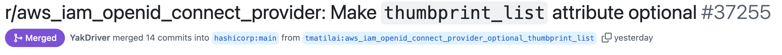 찾아보니 실제로 저와 같은 고민을 하고 테라폼에서 thumbprint_list 값을 Optional 로 바꾸는 작업을 진행하고 Pull Request 를 올려주신 분이 계십니다. 이를 확인하고 싶다면 다음을 참고하세요.