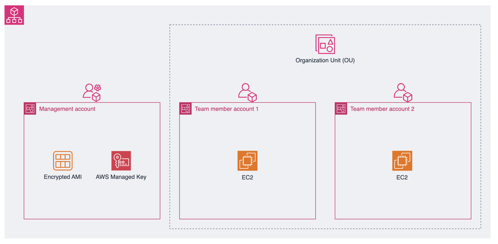 - EC2로부터 AMI를 생성하고, Organization Unit에 AMI와 KMS key를 공유