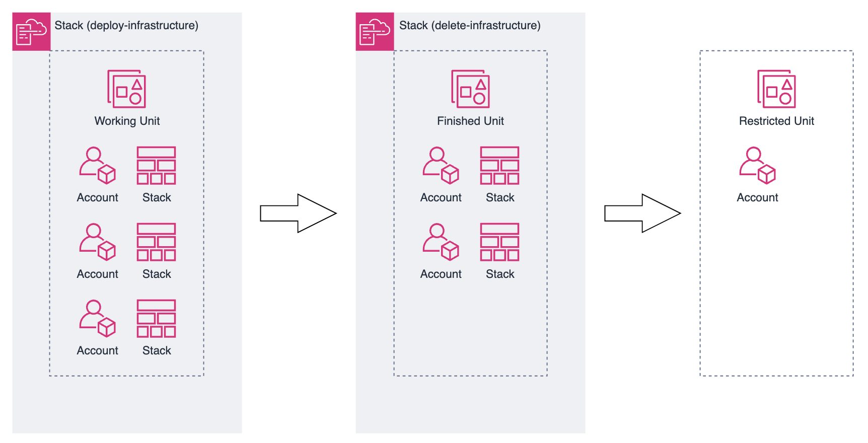 예를 들어 실습 환경이 구성되어 있는 Working Unit에 속한 계정을 Finished Unit으로 옮기면, 자동으로 실습 환경에 대한 Stack(deploy-infrastructure)이 제거되고 Cleanup에 대한 Stack(cleanup-infrastructure)이 생성됩니다. 따라서 저는 계정을 옮겨주기만 하면 알아서 실습 환경 정리를 할 수 있는 것이죠.