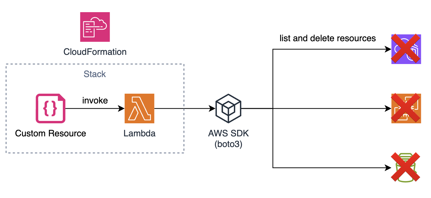 단순히 deploy-infrastructure를 삭제하는 것만으로는 실습 과정에서 생성된 추가적 리소스를 삭제할 수 없습니다. Cleanup 템플릿은 CloudFormation의 Custom Resource를 활용합니다. Custom Resource를 활용해 Lambda 함수를 호출하고, 그 Lambda 함수가 SDK를 이용해 계정 내 생성된 리소스들을 조회하여 삭제합니다. 이러한 방식을 통해 실습 과정에서 생성된 추가적 리소스들을 삭제할 수 있었습니다.