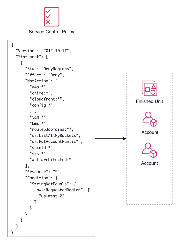 Finished Unit은 실습을 마친 멤버들의 계정을 포함시킵니다. 유닛에 대한 구조는 Working Unit과 크게 다르지 않습니다. 해당 유닛엔 마찬가지로 Oregon 지역 외의 모든 리전에 대한 권한을 차단했습니다. 실습을 마친 계정에 모든 권한을 바로 차단하지 않는 이유는 StackSets이 실습 리소스를 삭제하기 위한 권한을 부여해야 하기 때문입니다. 이 유닛에 실습 환경 Cleanup을 위한 StackSets을 배포합니다. (Cleanup에 대해서는 CloudFormation StackSets 파트에서 자세히 다룹니다)
