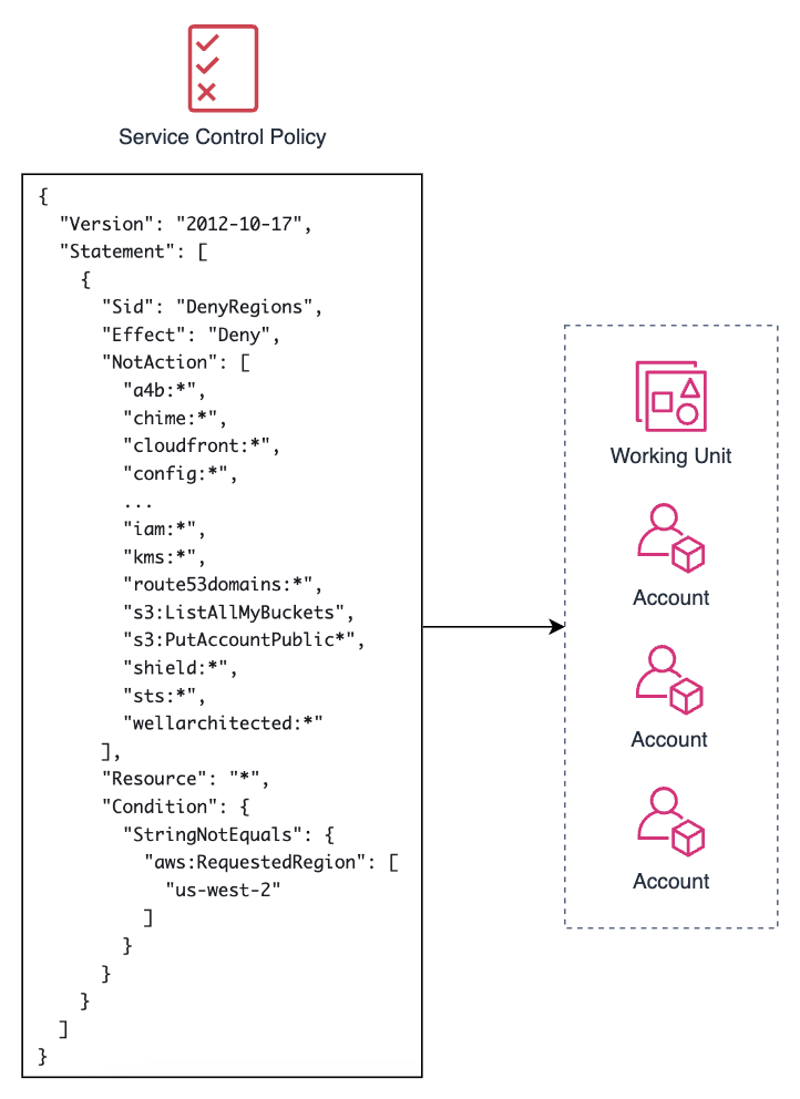 Working Unit에는 실습을 진행중인 멤버들의 계정을 포함시킵니다. 해당 유닛엔 Oregon 지역 외의 모든 리전에 대한 권한을 차단했습니다. Oregon 지역을 선택한 이유는 저희가 사용하는 리소스들의 가격이 타 리전보다 저렴하기 때문입니다. 권한 설정을 보시면 전체 리소스에 대한 와일드카드(*)를 쓰지 않고 제한할 리소스들을 명시해둔 것을 확인할 수 있습니다. 와일드카드를 쓰지 않는 것은 글로벌 서비스에 대한 접근을 허용해주기 위함입니다. SCP에서 명시적으로 거부한 리소스들에 대해서는 허용 규칙을 만들어도 절대 허용해주지 않습니다. 그렇기 때문에 AWS Documentation에서도 그림의 정책과 같은 방식으로 리전을 제한할 것을 권장합니다.