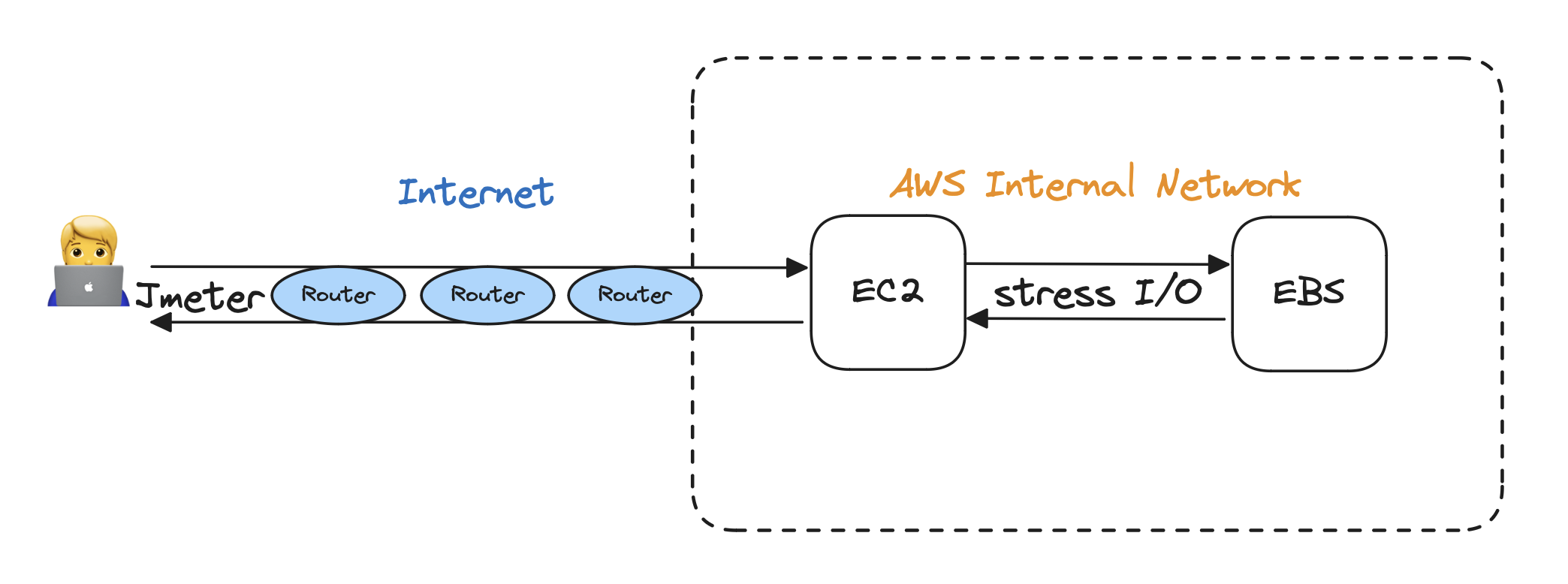 Jmeter로 EC2에 요청을 보내는 것은 Internet을 거쳐 이루어지고, EC2-EBS는 AWS 내부 네트워크를 거쳐 이루어집니다. 둘의 Bandwidth는 다르고, 서로 연관이 없습니다.