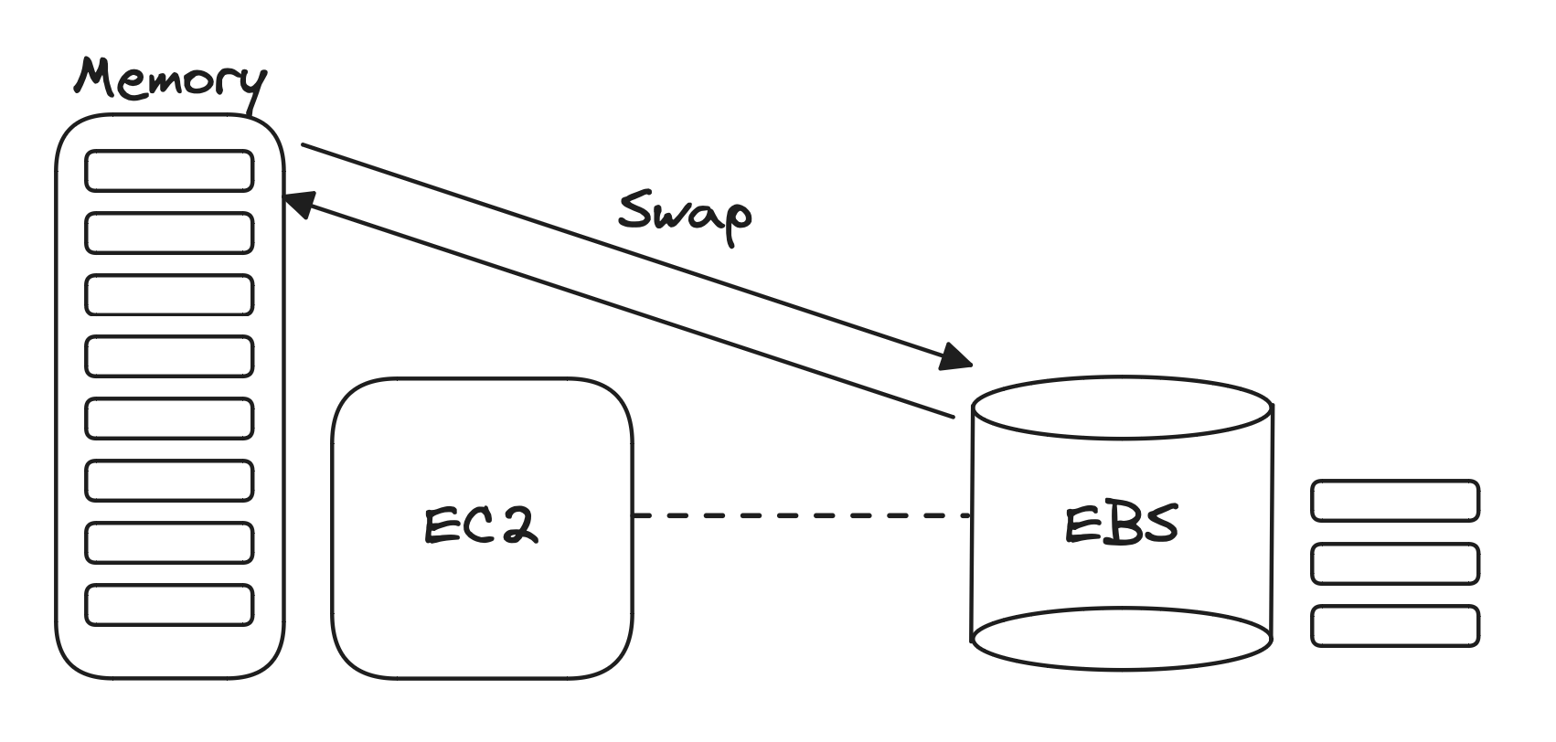 스왑 메모리는 주 메모리가 부족할 때 하드디스크와 같은 공간을 메모리로 사용하기 위한 가상 메모리입니다. t2.micro 인스턴스를 사용하는 보통의 소규모 프로젝트를 기준으로 말씀드리자면, EC2와 연결된 저장 장치인 EBS(Elastic Block Storage) 볼륨에 스왑 메모리를 할당할 수 있습니다.
