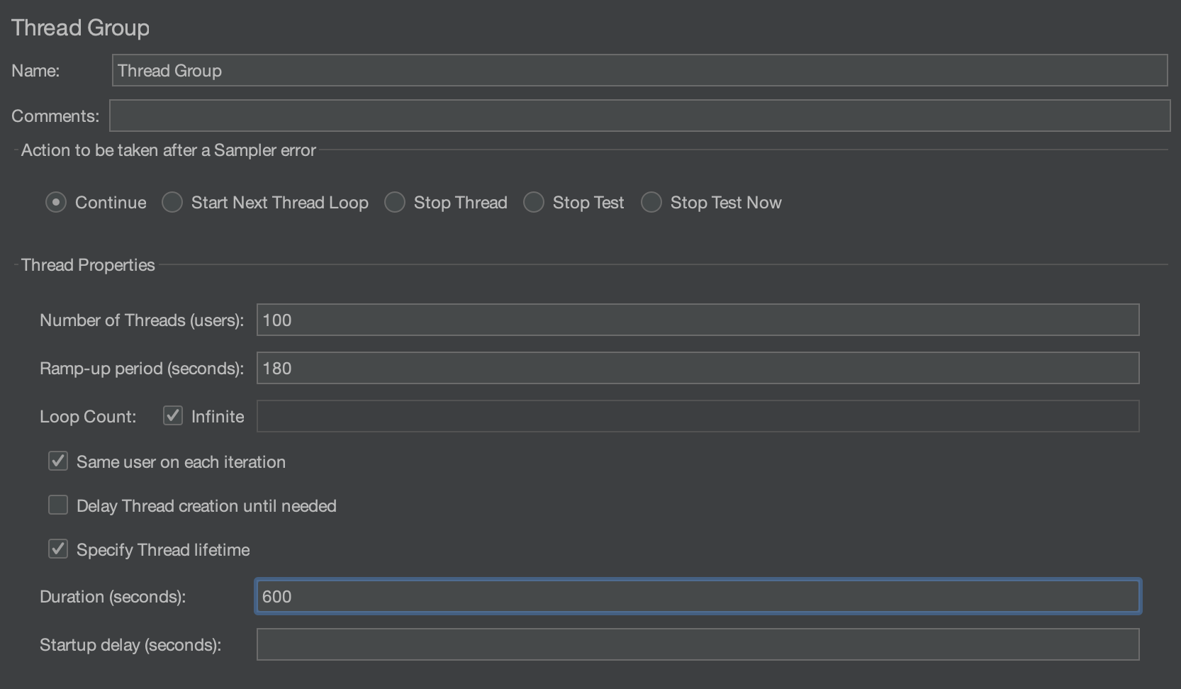 시나리오는 다음과 같이 작성합니다. 10분간 테스트가 지속되며, Ramp-up 기간은 3분입니다.