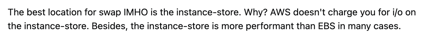 Instance Store 볼륨을 사용한다고 무조건 잘 한 것은 아닙니다. insacne store 볼륨으로의 스왑보다는 RAM 스펙을 업그레이드 하는 것이 성능상 더 좋으니까요.